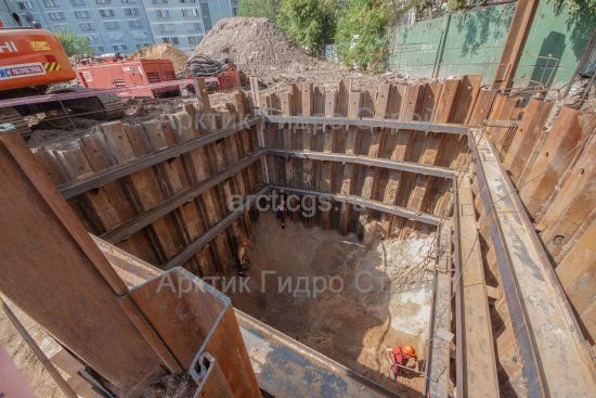 - подкосы – опираются на шпунты и на грунт (подошву фундамента, дополнительные сваи).