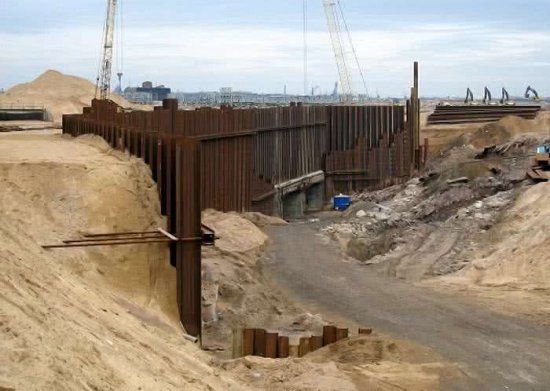 Наша строительная компания выполняет работы по строительству дамб с укреплением откосов металлошпунтом.